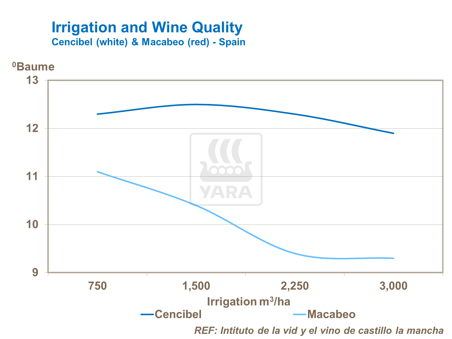 In the same Spanish trials, irrigation had no effect on °Baumé in white grapes, but reduced °Baumé in red wine grapes. The pH of the wine was also reduced, but there was no effect on wine color. Recent trials by Yara Iberia have shown similar effects.