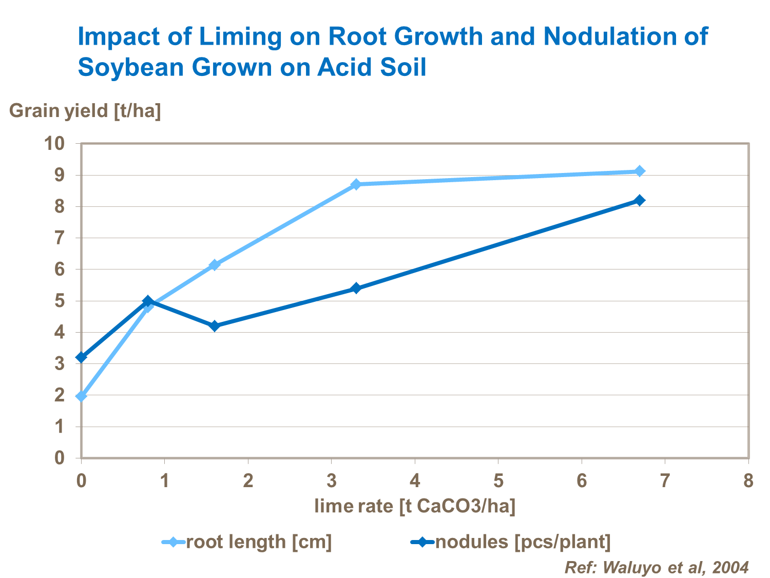 In Brazil, increases of soybeans yield in limed soils has been observed as a result of the pH increases, reduction of Al and Mn toxicity, increased absorption of N, P, K and S, and the supply of Ca and Mg.