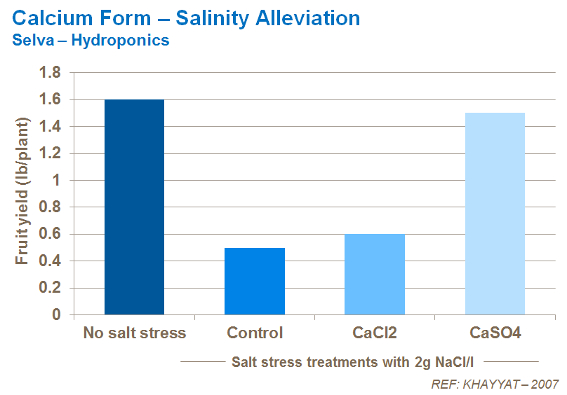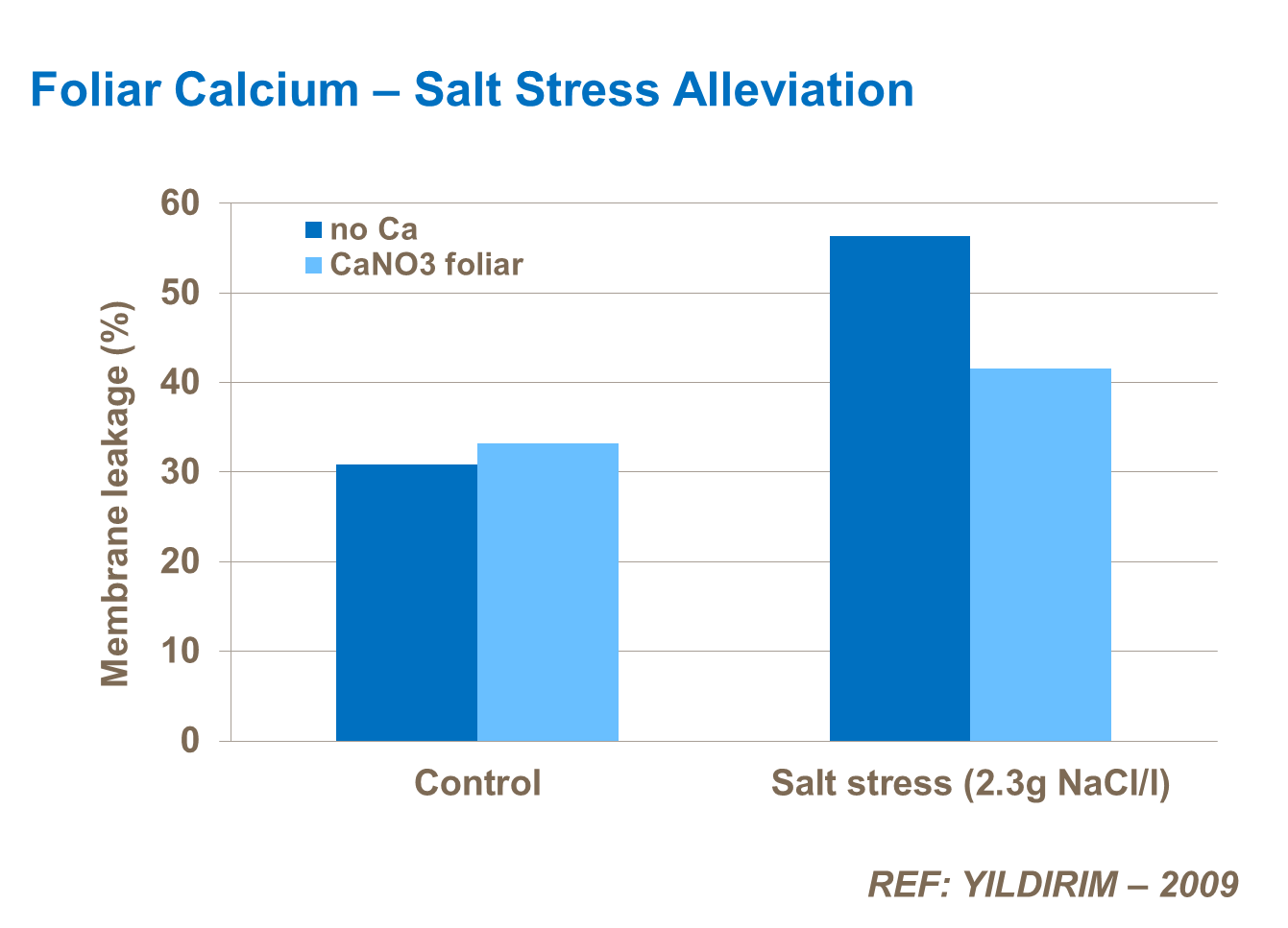 Where salinity is an issue, use of calcium can help to mitigate these effects. In trials, adding extra Ca in a saline situation helps to reduce cellular breakdown and leakage and improve growth and yield. Calcium nitrate or calcium sulfate forms are effective and trials show that they can be applied through fertigation or foliar sprays to help reduce salinity stress.